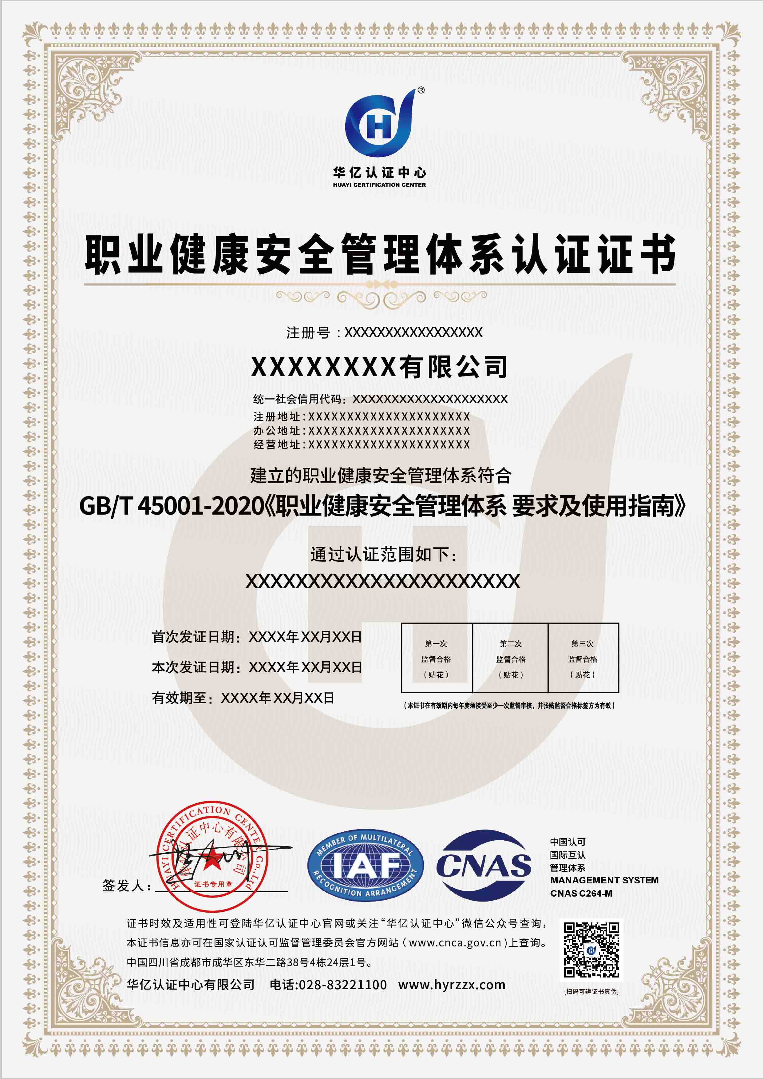 职业健康安全管理体系证书